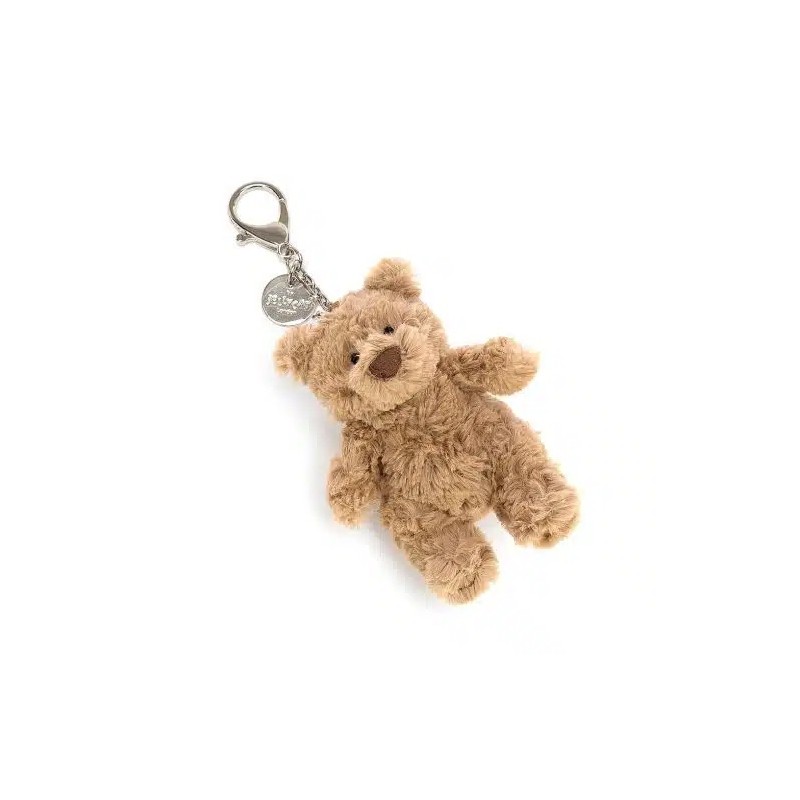 Scatenatevi con il ciondolo da borsa Bartholomew Bear! Questo piccolo compagno di viaggio, dal colore caramella mou, verrà con voi ovunque andiate. Con una robusta clip d'argento e un charm Jellycat, Bartholomew è sempre con voi! Ora, raccogliamo qualche gustosa bacca!