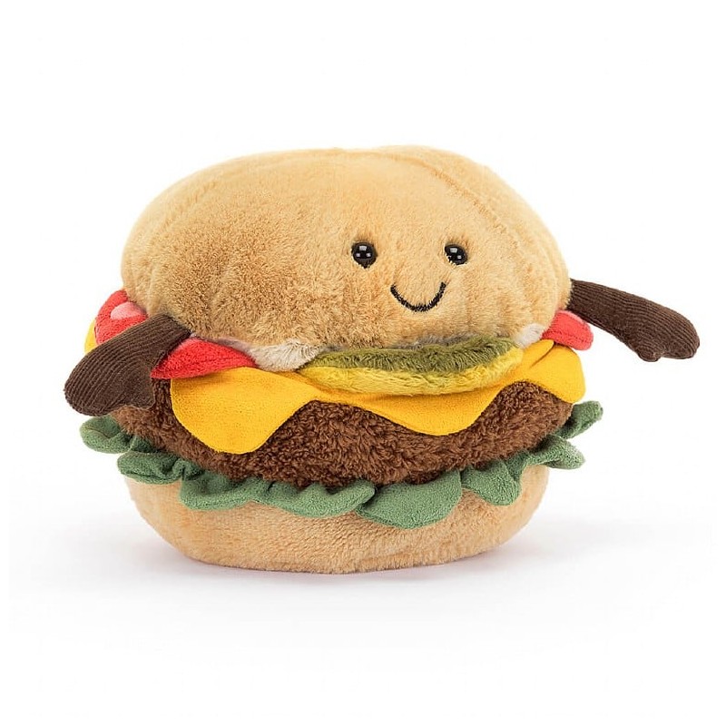 Protagonista di ogni barbecue, questo soffice Burger è pronto per stupire! Questo hamburger è composto da un pane dorato bicolore, braccia color corda, un soffice cetriolino verde, una fetta di formaggio e fresca lattuga! Oh sì, e un grosso e appetitoso hamburger!