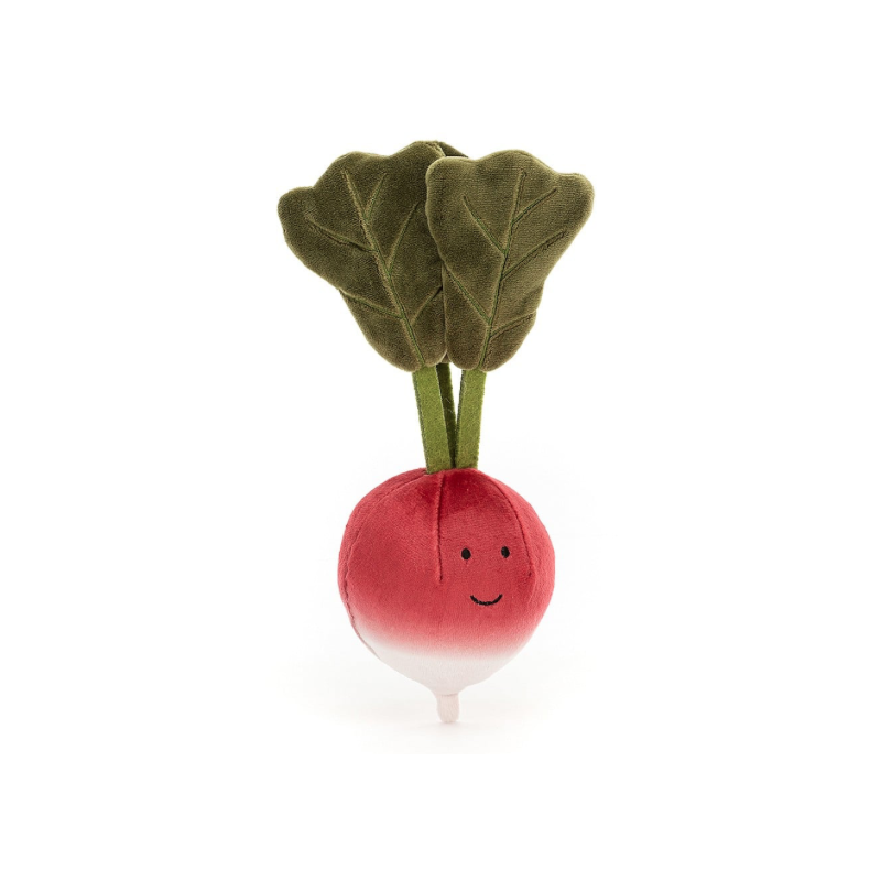 Più morbido che croccante, Il Ravanello è un amico molto rinfrescante! Il pelo di un bel colore vivace con una sfumatura rosa-bianca, con un ciuffo di foglie di velluto verde cucite, questo simpatico ortaggio si apre per salutare! Una mascotte da cucina o un regalo buffo e divertente.