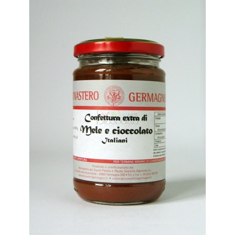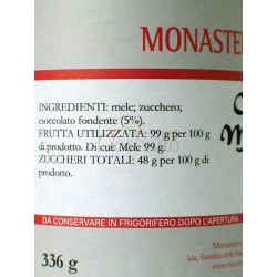 Ingredienti: mele, zucchero, cioccolato fondente (pasta di cacao, zucchero, burro di cacao, lecitina di soia, estratto di vaniglia) per 100 g di prodotto.