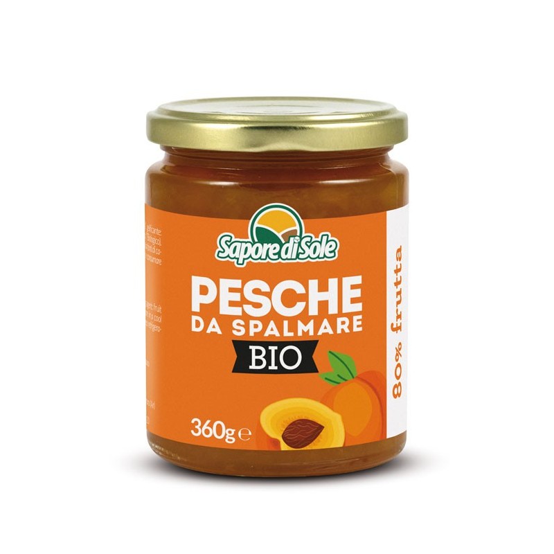 Ingredienti: Pesche*, zucchero di canna*. gelificante: pectina da frutta, acidificante: acido citrico (*Biologico). Frutta utilizzata: 80g per 100g, zuccheri utilizzati: 60g per 100g
