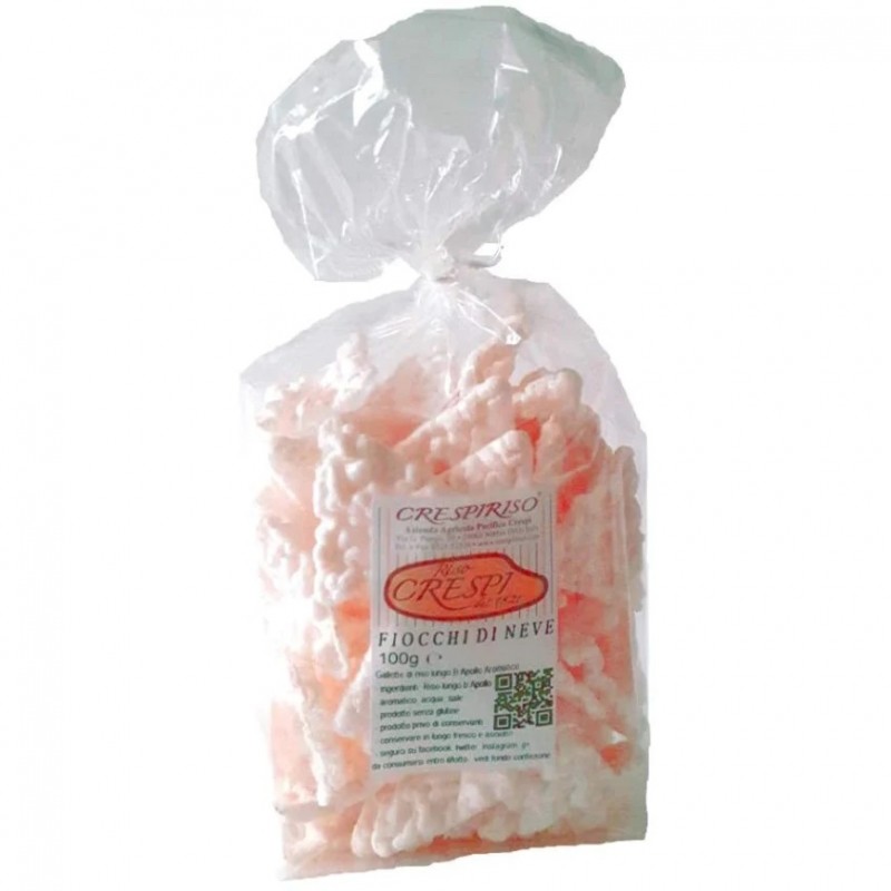 I fiocchi di neve crespiriso sono sottilissime gallette di riso aromatico Apollo; leggeri; ma deliziosi e aromatici snack di forma triangolare, croccanti e gustosi, senza glutine. queste gallette vengono preparate solo con riso aromatico Apollo, acqua e sale. Le potete gustare anche nelle varianti: con riso rosso Ermes e riso nero Venere. Ottime come sostitutivo del pane, per accompagnare aperitivi, formaggi, salumi, vino, birra, salse, snack ideale per uno spuntino a metà giornata o per merenda. Sono prodotte solo con ingredienti semplici e genuini: riso aromatico, acqua e sale. Utilizzate anche nella dieta dei bambini e in regimi alimentari a basso contenuto calorico e altamente digeribili.