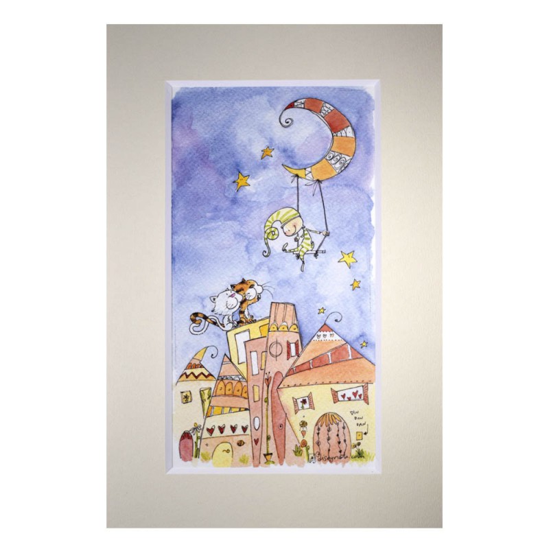 Riproduzione di acquerello su carta martellata illustrazione 11×21,5 cm montata su passepartout 3 mm sbassato a 45° e cornice in abete grezzo 25×35
