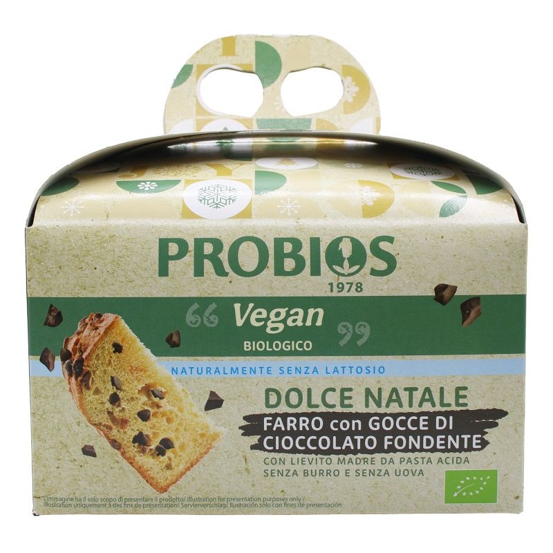 Ingredienti: Farina di grano farro* 40%, zucchero di canna*, gocce di cioccolato fondente* 12% (zucchero di canna*, pasta di cacao*, burro di cacao*, aroma naturale di vaniglia), olio di semi di girasole*, lievito naturale da pasta acida di grano* 9% (*farina di grano 63%, acqua), sciroppo d'agave, grasso vegetale* (*karité), emulsionante: lecitina di soia*; farina di piselli*, malto d'orzo*, sale marino, aroma naturale di agrumi (arancia, limone), aroma naturale di vaniglia.