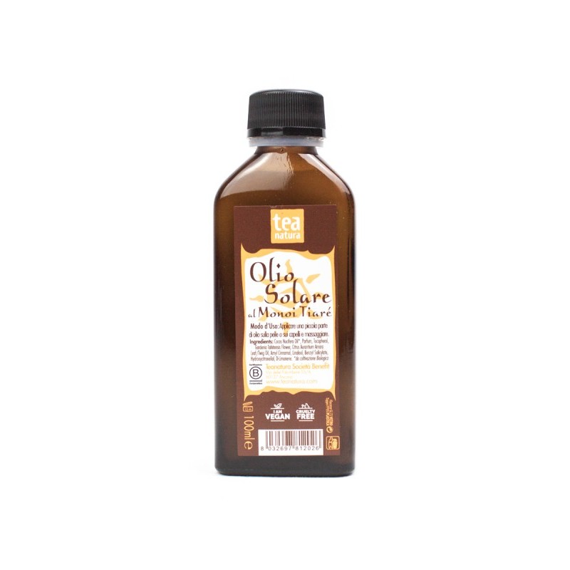 L'Olio Solare al Monoi Tiaré Tea è ottenuto dalla miscelazione di Olio di Cocco con Olio Essenziale di Gardenia Tahitensis (Monoi Tiaré). Può essere utilizzato sia per favorire una abbronzatura intensa sia come olio da massaggio sia per i capelli come impacco pre-shampoo o, in piccole dosi, come nutriente dei capelli stessi e del cuoio capelluto. Non essendo utilizzato nella formulazione alcun tipo di filtro solare, è consigliato per pelli già abbronzate quindi già esposte al sole. E' sconsigliato il suo uso su pelli delicate, sulla cute dei bambini o in occasione delle prime esposizioni al sole.