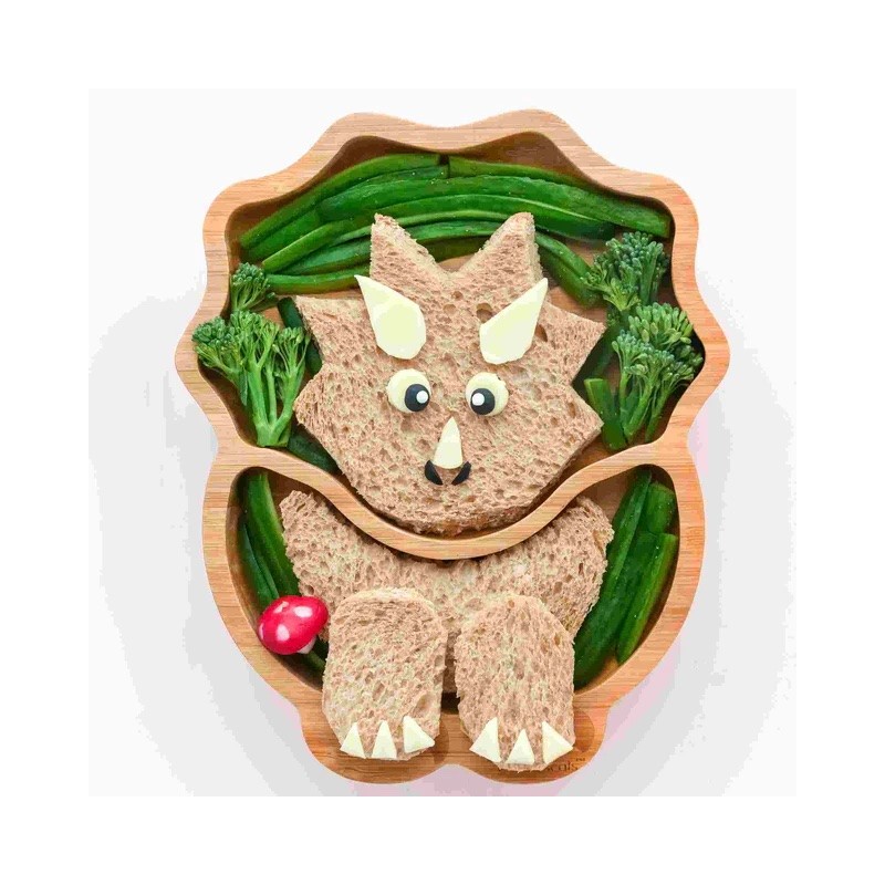 Questo grande piatto a forma di dinosauro è dotato di due sezioni dove i bambini si possono divertire a separare i gruppi di alimenti.