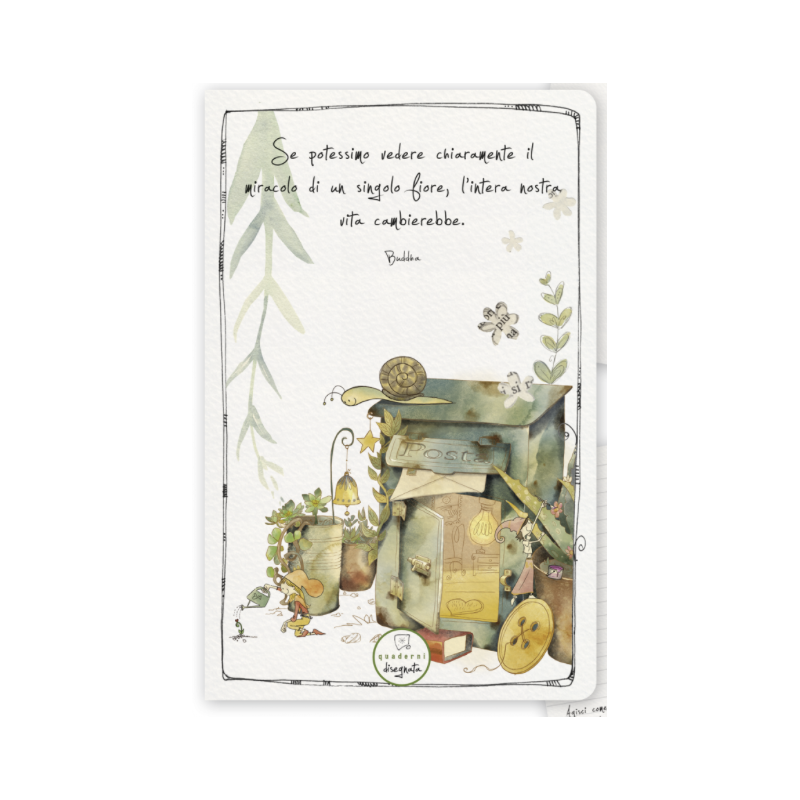 Quaderno A6 con illustrazioni ed aforismi stampato in carta ecologica certificata, plastic free e 100% made in Italy.