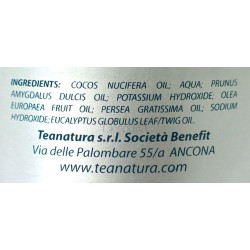 INCI: Cocos Nucifera OIl, Aqua, Prunus Amygdalus Dulcis Oil, Potassium Hydroxide, Olea Europaea Fruit Oil, Elaeis Guineensis Oil, Persea Gratissima Oil, Sodium Hydroxide, Eucalyptus Globulus Leaf Oil.